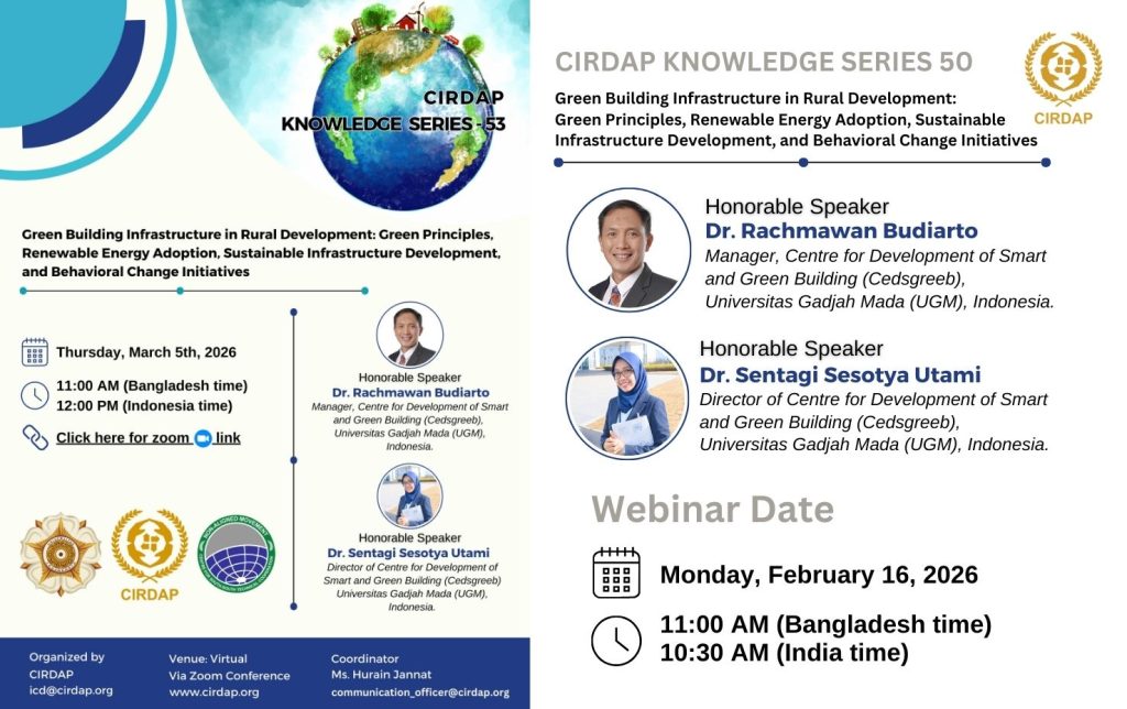 As a part of the CIRDAP Knowledge Series – 2026, a webinar on ‘Green Building Infrastructure in Rural Development’ is going to be held on (Thursday), March 5th, 2026, at 11:00 a.m. Bangladesh time (12 p.m. Indonesia time). Recognizing the importance of green building infrastructure for sustainable rural development; CIRDAP in collaboration with the Non-Aligned Movement Centre for South-South Technical Cooperation (NAM CSSTC), and Universitas Gadjah Mada (UGM) will jointly organize this webinar. In the webinar, the Green Principles, Renewable Energy Adoption, Sustainable Infrastructure Development, and Behavioral Change Initiatives of Green buildings related to rural development will be discussed. The webinar will focus on the application of green building infrastructure principles in the context of rural development. The scope of the webinar includes: Honorable Speakers:Dr. Rachmawan BudiartoManager, Centre for Development of Smart and Green Building,Universitas Gadjah Mada (UGM), Indonesia. Dr. Sentagi Sesotya UtamiDirector of Centre for Development of Smart and Green Building (Cedsgreeb)Universitas Gadjah Mada (UGM), Indonesia. Link to join: https://zoom.us/j/91304099214?pwd=o4yIVKO6nW9rclJVFEEobEZrtcpT0s.1 Meeting ID: 913 0409 9214 Passcode: 108893 — Join instructions https://zoom.us/meetings/91304099214/invitations?signature=jPSrMAtCaaH0f-Aw0NAHahitgu1hf2lpPJRqRbKjUYA