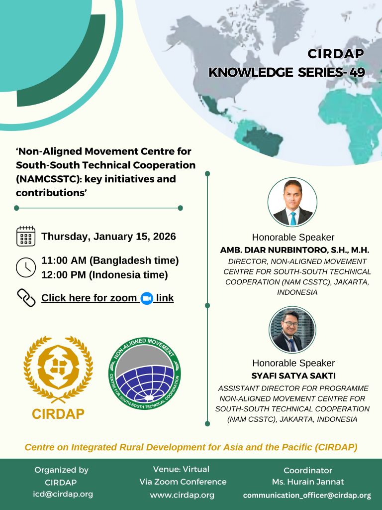 CIRDAP is commencing its webinar series under the Knowledge Series of 2026, and the webinar titled ‘’Non-Aligned Movement Centre for South-South Technical Cooperation (NAMCSSTC): key initiatives and contributions’ is going to be held on Thursday, January 15, 2026, at 11:00 a.m. Bangladesh time (12:00 p.m. Indonesia time).
