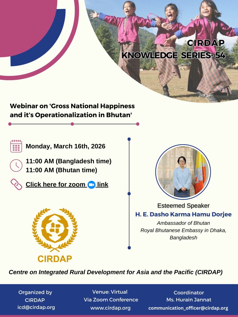 Webinar on ‘Gross National Happiness and its Operationalization in Bhutan’ will be held on (Monday), March 16th, 2026, at 11:00 a.m. Bangladesh time (11:00 a.m. Bhutan time). Her Excellency Dasho Karma Hamu Dorjee, Ambassador of Bhutan, Royal Bhutanese Embassy in Dhaka, Bangladesh will be embraced as the esteemed speaker of the webinar.