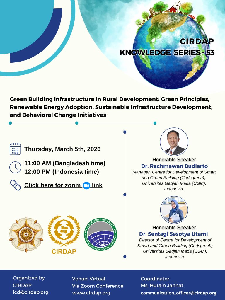 As a part of the CIRDAP Knowledge Series – 2026, a webinar on ‘Green Building Infrastructure in Rural Development’ is going to be held on (Thursday), March 5th, 2026, at 11:00 a.m. Bangladesh time (12 p.m. Indonesia time).